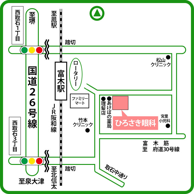 JR阪和線富木駅下車、東へ徒歩すぐの眼科です。